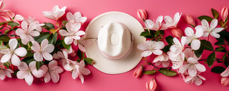 Wide Brimmed White Hat Surrounded by Pink and White Flowering Branches on Pink Background Elegant Spring or Summer Fashion Scene AI Generative