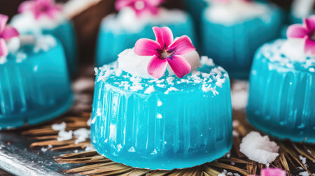 Delight in these vibrant blue gelatin desserts topped with bright flowers and coconut flakes, perfect for summer parties and festive gatherings.