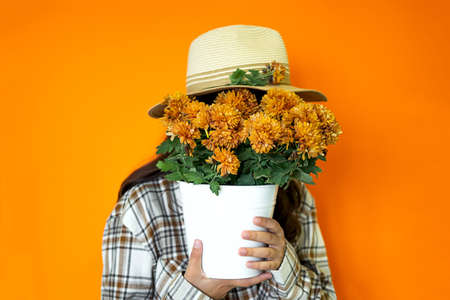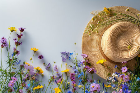 Straw hat with beautiful flowers bouquet of daisies and chrysanthemum beneath. Pastel background, flatlay.