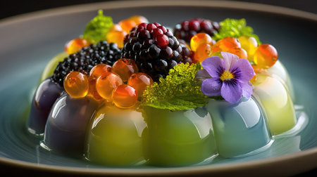 An exquisite dessert featuring colorful jelly topped with fresh berries and edible flowers, beautifully arranged on an elegant plate, perfect for special occasions.