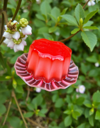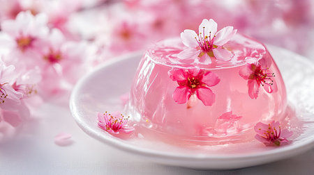 A visually stunning pink jelly dessert adorned with delicate cherry blossoms, perfect for spring celebrations or elegant occasions. A feast for the eyes.