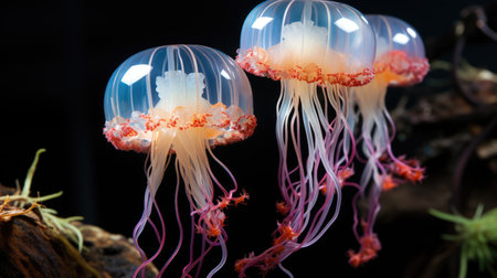 Group of rare colored jellyfish close-up, dark background. AI generated. Marine ocean fauna, wildlife. Header banner mockup with copy space.