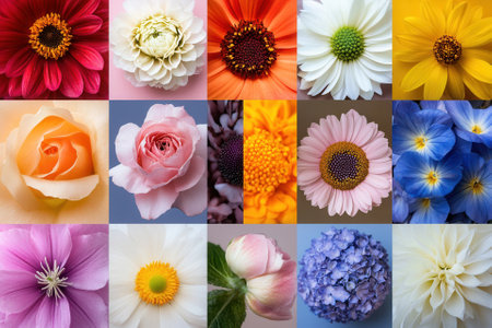 A colorful collection of 15 close-up flower images in a grid pattern.