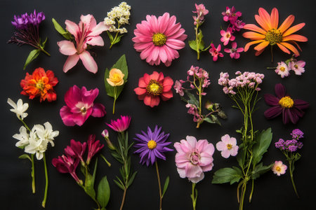 Colorful flowers arranged on a black background. (1)