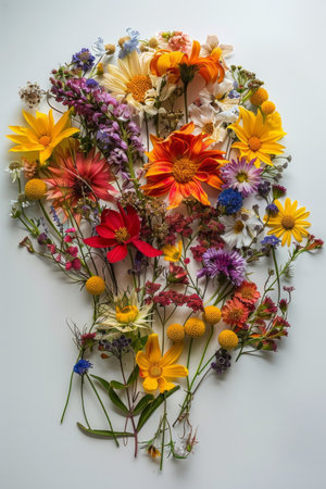 A creative portrait of a human head made of colorful flowers, embodying a harmonious blend of nature and art, representing beauty, growth, and freshness