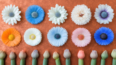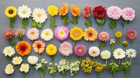 A striking display of colorful flowers arranged neatly on a light background, showcasing the beauty and diversity of nature's blooms. Perfect for decor.