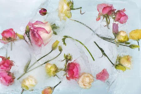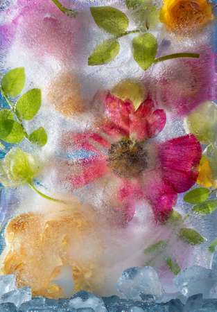 Many frozen flowers in ice background. Frozen fresh beautiful rose flower in the ice. Thawing flower. Frozen Floral background