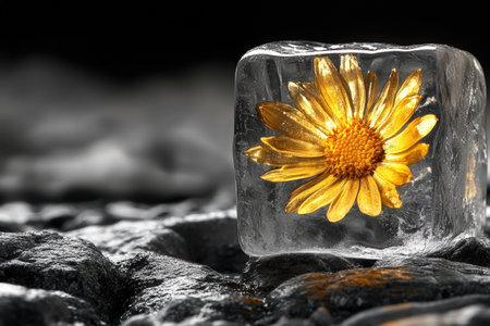 A vibrant golden flower is trapped within a clear ice cube, placed on dark stones, emphasizing the intricate details and textures of nature's beauty in a striking visual display