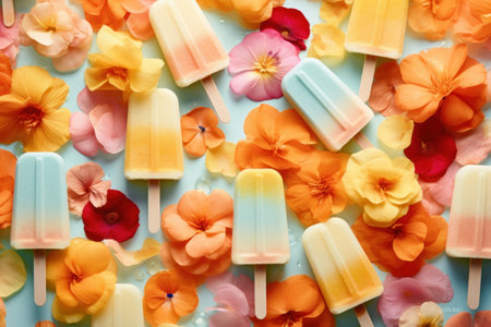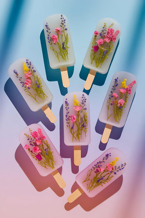 assorted fruit ice cream in pastel colors on a light blue background with bright flowers