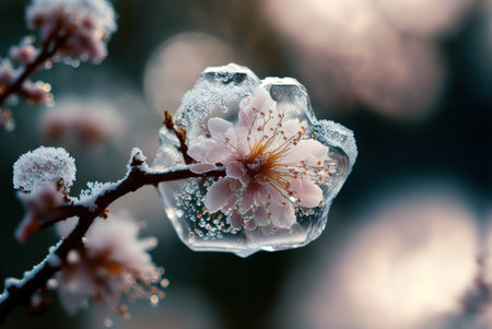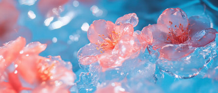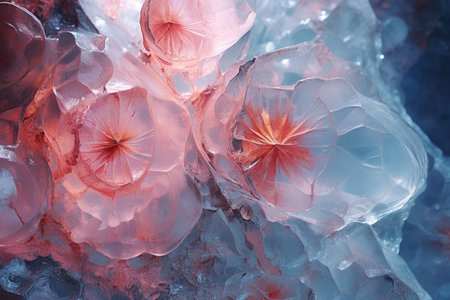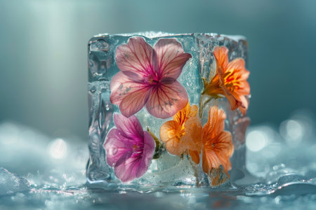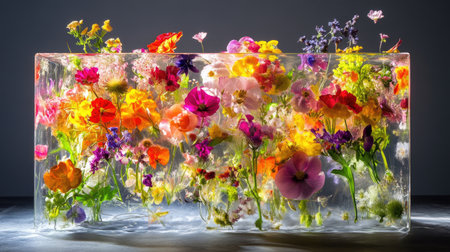 Frozen beauty of colorful flowers encased in delicate ice crystals