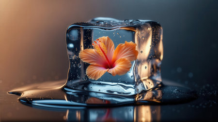 Close-up of a vibrant orange hibiscus flower encased in a melting ice cube on a reflective surface, symbolizing contrast between warmth and cold.