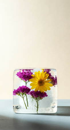 Yellow daisy and purple flowers are beautifully preserved in a clear ice cube, highlighting their vibrant colors and delicate textures in a serene setting, AI generated