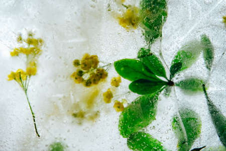 Frozen flowers in an ice cube.Ice texture.Ice with flowers.Abstract floral background