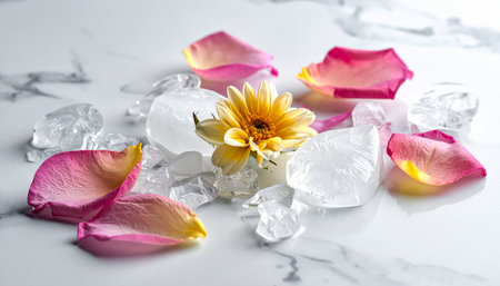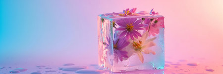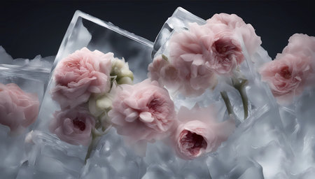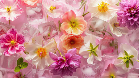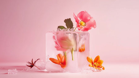 Vibrant Flowers Encased in Ice on Pink Background for Beauty Product Design.
