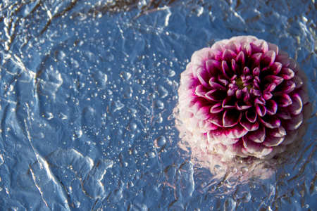 purple dahlia flower with white edges on a silver background with water drops. copy space, background with flowers. flat layout.