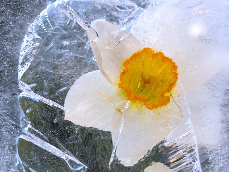 Ice cube with flower in the snow. Beautiful nature background. Spring concept.