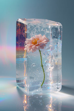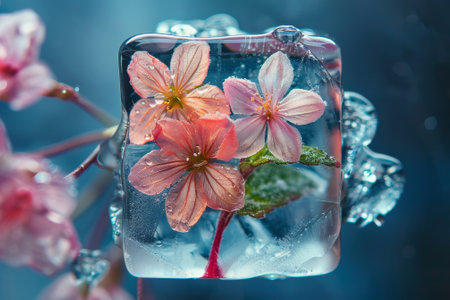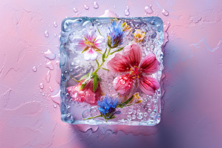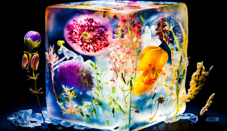 Stunning ice cube encapsulating delicate flowers and bubbles, creating a vibrant and artistic scene perfect for creative design and nature lovers.