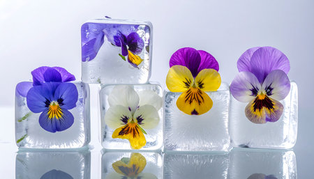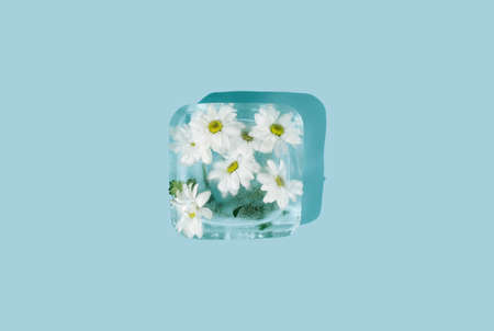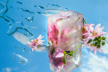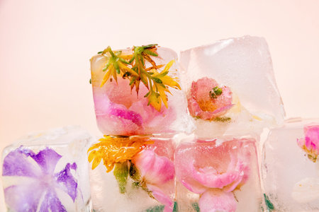 Fresh blossom flowers frozen inside ice cubes with colorful petals. Beautiful and abstract representation of nature and the beauty of frozen water.