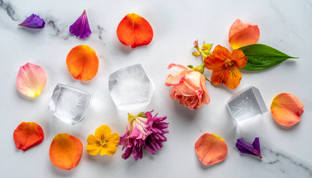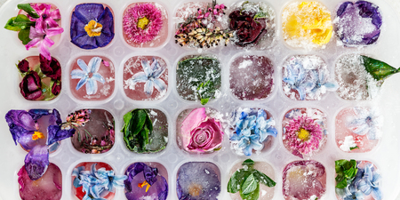 A close up of a table with a bunch of ice cubes and flowers. edible flower