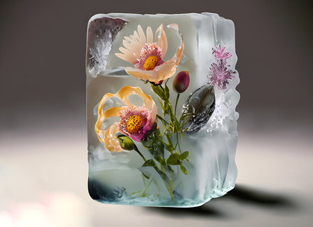 Beautiful flowers and a blob object is frozen in a block of ice, isolated on warm-grey background