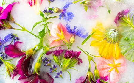 Various flowers in ice cubes. Creative floral background. Frozen beautiful plants.