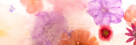 Summer banner of frozen flowers in ice, geraniums and petunias, mint and zinnias