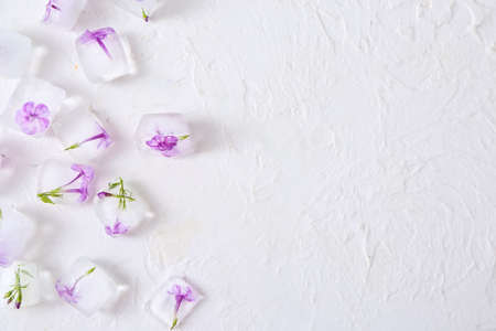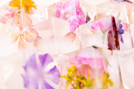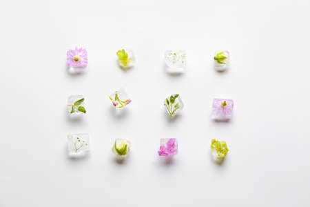 Frozen Flowers in Ice Cubes on Light Background, floral ice