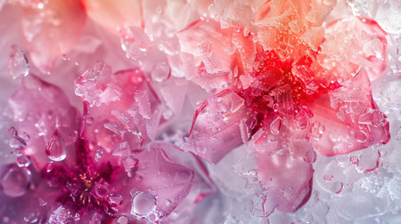 This stunning close-up showcases vibrant petals of flowers encased in ice, highlighted by glistening water droplets. The colorful background enhances the natural beauty and details, creating an artistic and tranquil visual experience.