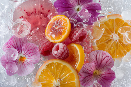 Vibrant berries and citrus fruits dancing in effervescent bubbles, evoking an underwater fantasy