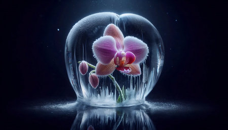 Captivating image of a vibrant orchid flower frozen in clear ice, accompanied by dynamic water bubbles and splashes, symbolizing purity and nature