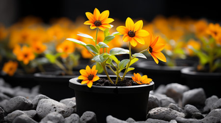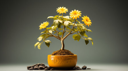 yellow flower pot with brown rocks on a grey background. this photo, in the style of mike campau, showcases a vibrant and lively still life. reminiscent of national geographic photography, the image features a monochromatic color scheme and intricate details, reflecting the influence of chinapunk aesthetics. ai generated