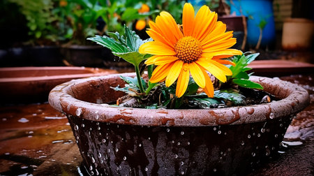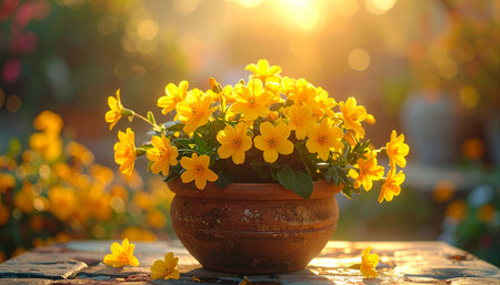 Yellow flowers in a clay pot on a wooden table in the garden