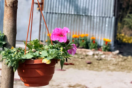 Beautiful flowering plants and flowers in a hanging flower pot