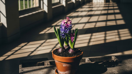 A cinematic, wide environmental photograph capturing a single clay pot of Hyacinth (Sonbol) flowers