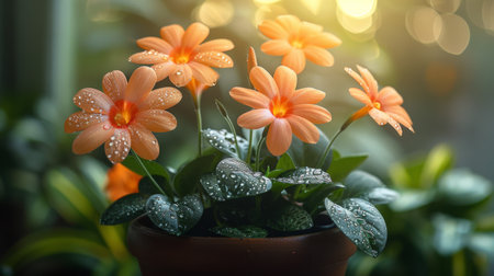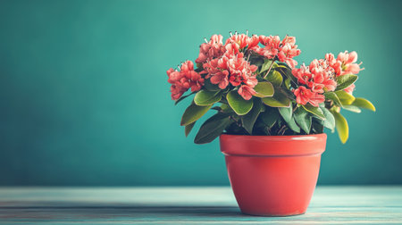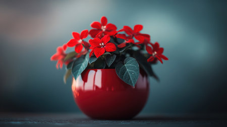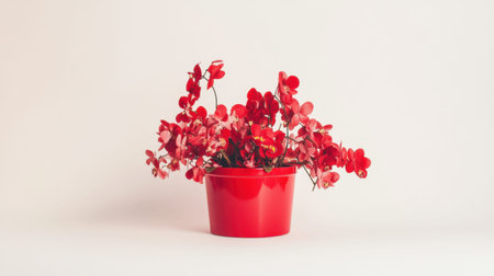 A stunning arrangement of vibrant red flowers in a glossy red pot creates a visually appealing centerpiece. Soft lighting enhances the beauty of the delicate petals and lush green leaves, adding a tranquil charm to any indoor setting.