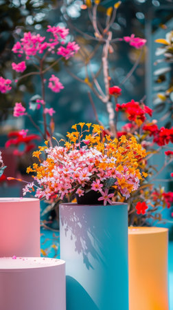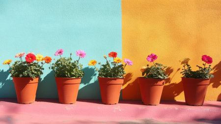 This vibrant image showcases colorful flower pots arranged in a harmonious line against a bright wall, perfect for highlighting the beauty of nature and decor.