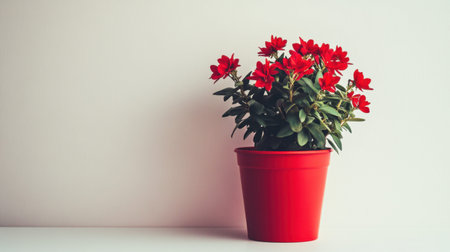 A stunning red flowering plant in a bright red pot sits elegantly against a neutral wall, perfect for enhancing any interior space and adding warmth.
