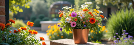 Vibrant summer garden display with colorful flower bouquet in copper pot. That the image is generated using AI.