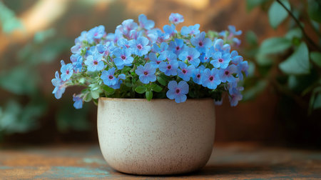 A potted plant with blue flowers sits gracefully on a concrete floor, bringing a touch of nature to the urban setting