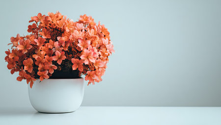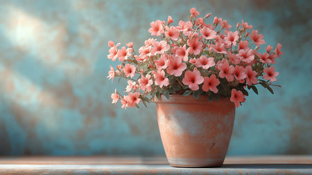 This captivating image features vibrant red flowers in a terracotta pot, set against a soft peach wall, perfect for enhancing home decor and bringing warmth to any space.