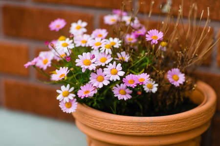 White daisy flower in a clay pot on the road in autumn