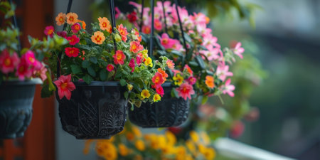Colorful hanging flower baskets adorn a balcony, creating a vibrant and cheerful outdoor decoration. High quality photo