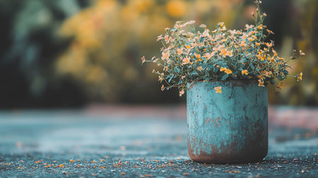 A weathered teal pot, showing signs of rust and peeling paint, holds a lush arrangement of small yellow flowers and green foliage.