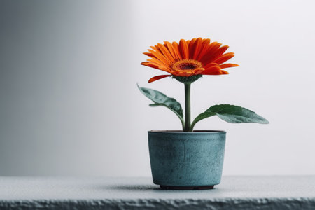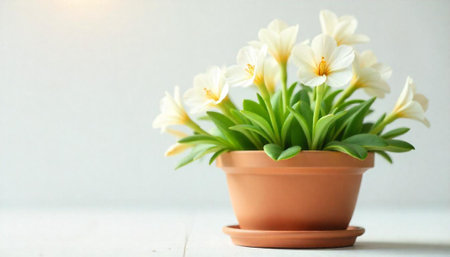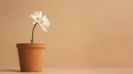 Flower pot on white table with copy space. Minimal style.