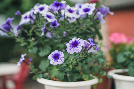 purple petunias. Purple Petunia - Surfinia Flowers with White speckles Looking like a Galaxy in the garden. Petunia plant with lilac flowers. Close up Petunia flowers. Purple Petunia flowers