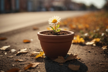 Daisy flower in a clay pot on the road with autumn leaves