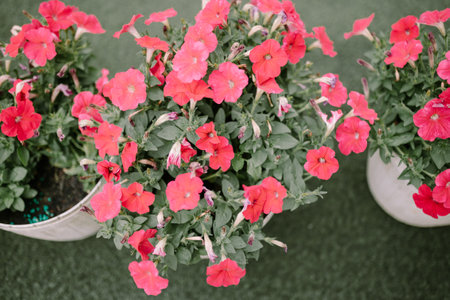 Generative AI : Pink petunia flowers in flowerpots on a background of a garden plot in spring or summer in sunlight