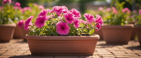 AI Generated. Pink petunia flowers in flowerpots on a background of a garden plot in spring or summer in sunlight
