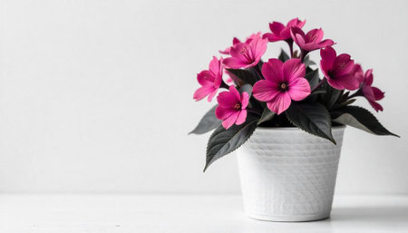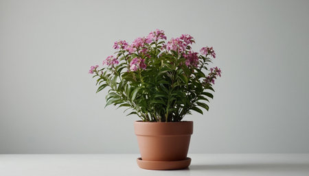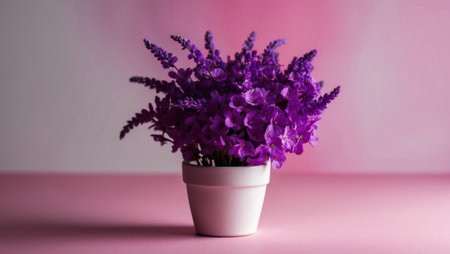 AI Generated. Purple Flowers in a Pot on a Pink Background