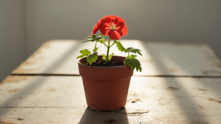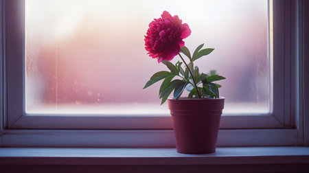 A striking red peony flower in a pot sits on a windowsill, illuminated by soft sunlight, creating a peaceful and elegant indoor atmosphere perfect for any space.